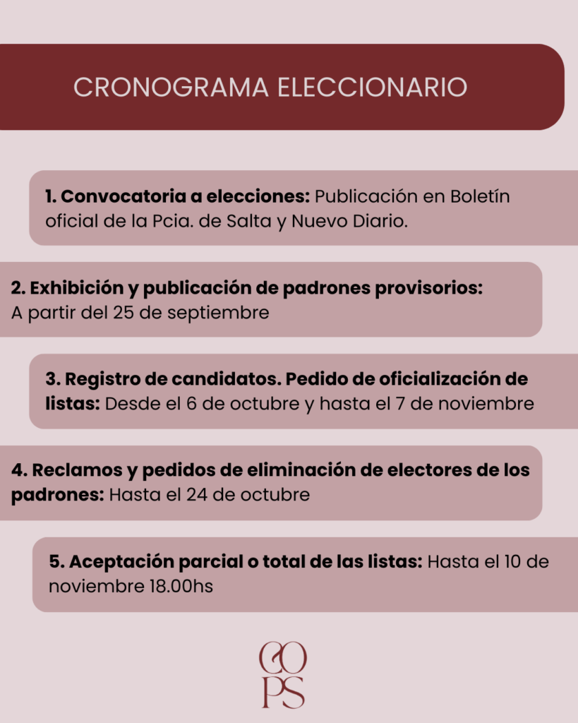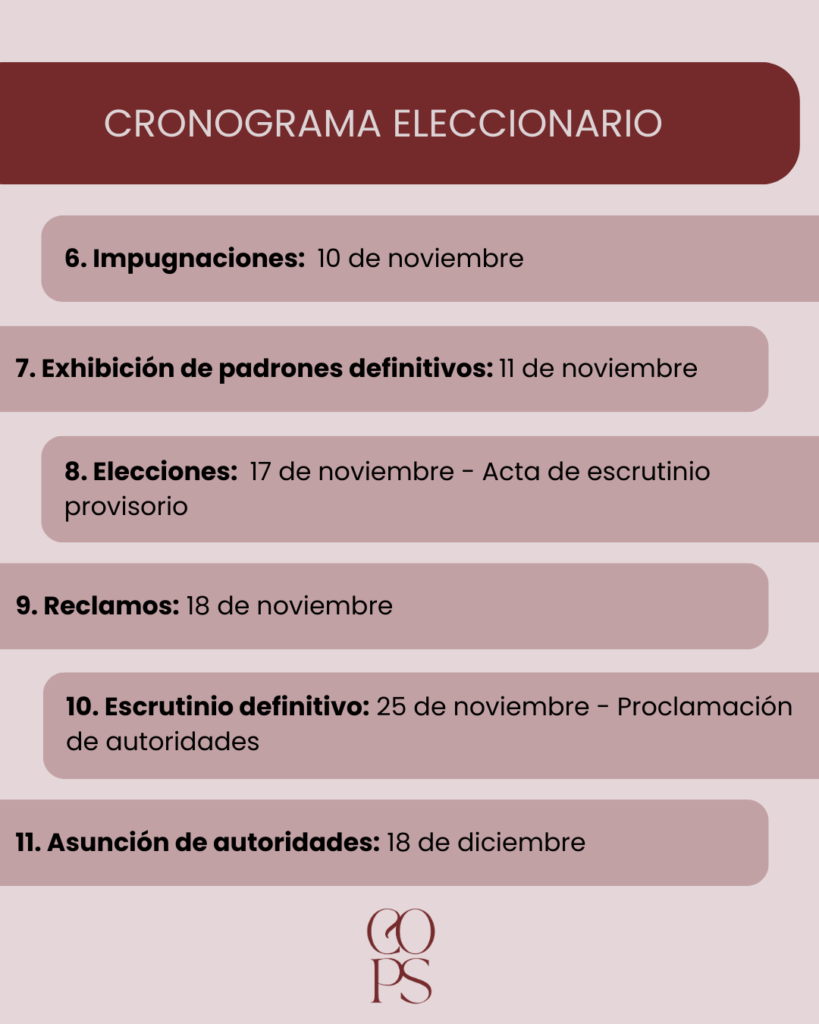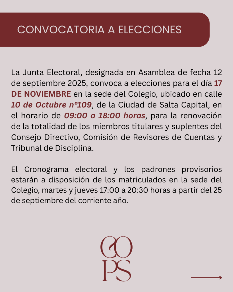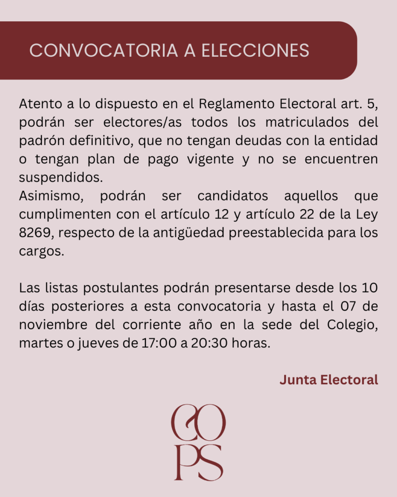 La Junta Electoral convoca a elecciones para el día 17 DE NOVIEMBRE en la sede del Colegio, para renovación de la totalidad de los miembros.