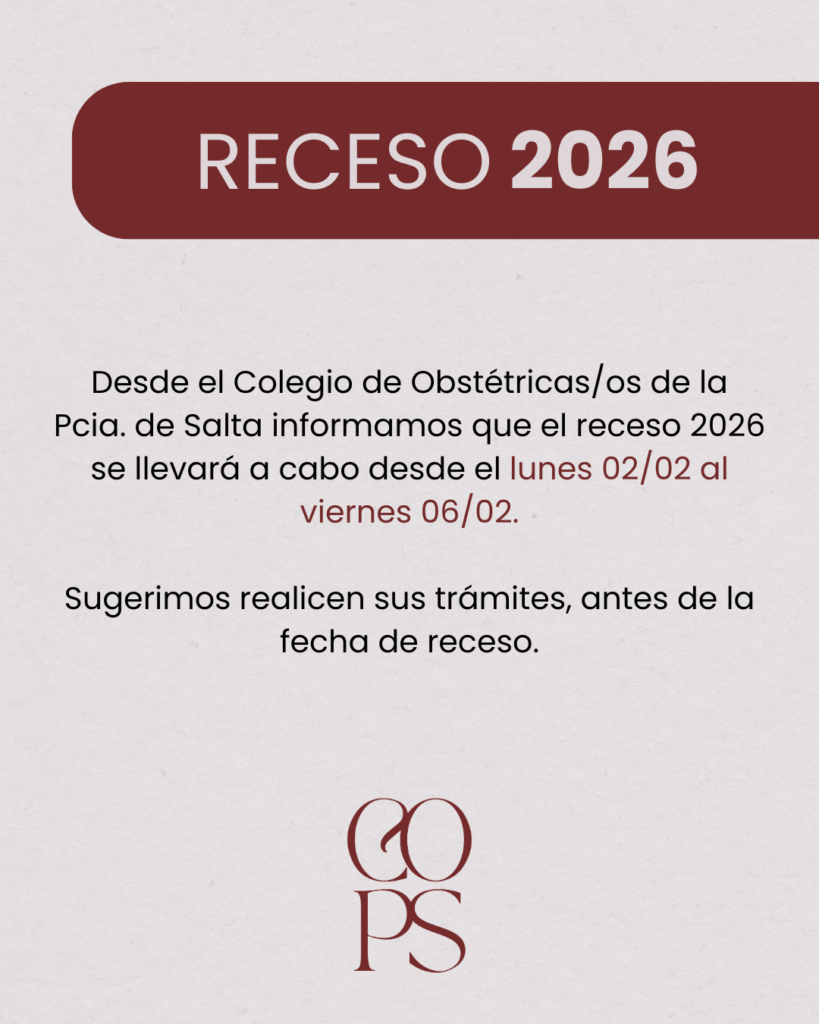 El Colegio de Obstétricas/os de la Pcia. de Salta informa su receso 2026, el cual se llevará a cabo a partir del lunes 02/02 al viernes 06/02.